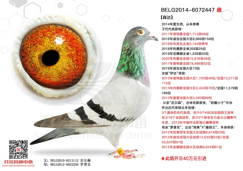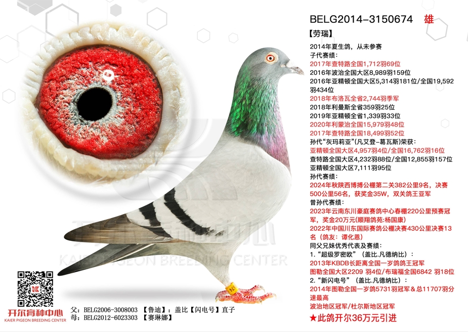 劳瑞与森达的直接子代在赛场上表现卓越,为开尔赢得了诸多荣誉。从2023年阳光大棚的前十名、加站赛殿军,到2024年陕西博搏双关鸽王亚军、预赛第9名、决赛第56名,这些成绩都来自劳瑞与森达的直子女。开尔不仅是奶酪王朝的继任者,也是盖比王朝的大本营。劳瑞与森达的配对不仅是盖比与奶酪两大血系的强强联合,更是开尔在育种中的经典范例,延续了两大血系的辉煌基因。