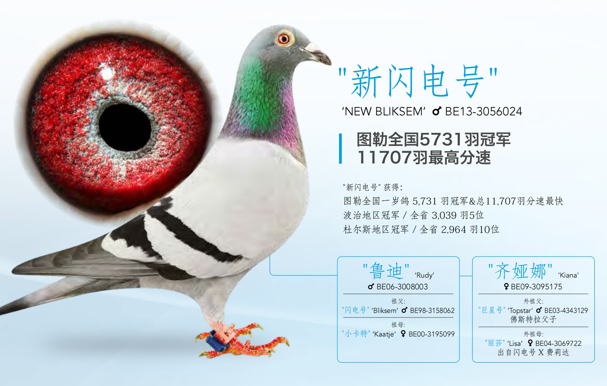 盖比特别高兴的是,新闪电号是由他的名鸽鲁迪直接作育的,他认为这羽鸽子有望成为鲁迪最优秀的后代,继承盖比闪电家族的荣耀。