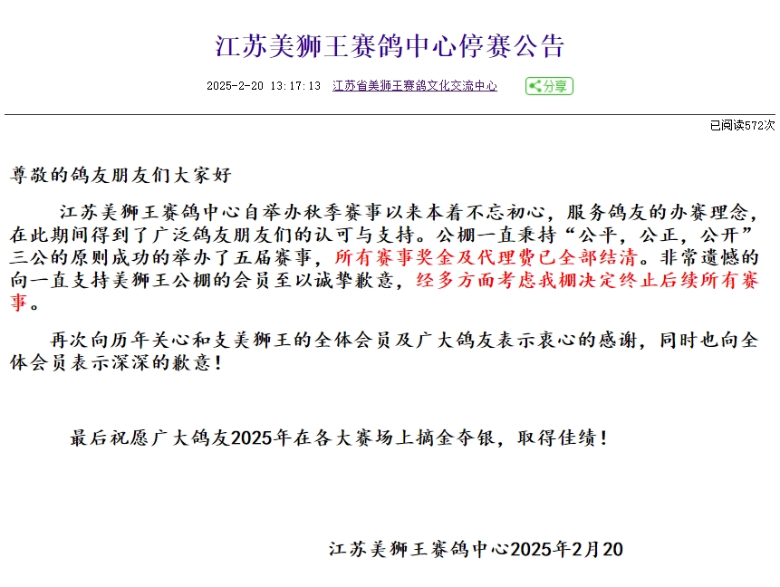 2月20日,江苏美狮王发布公告,宣布停办比赛。公告中称“所有赛事奖金及代理费已全部结清……经多方面考虑我棚决定终止后续所有赛事。”