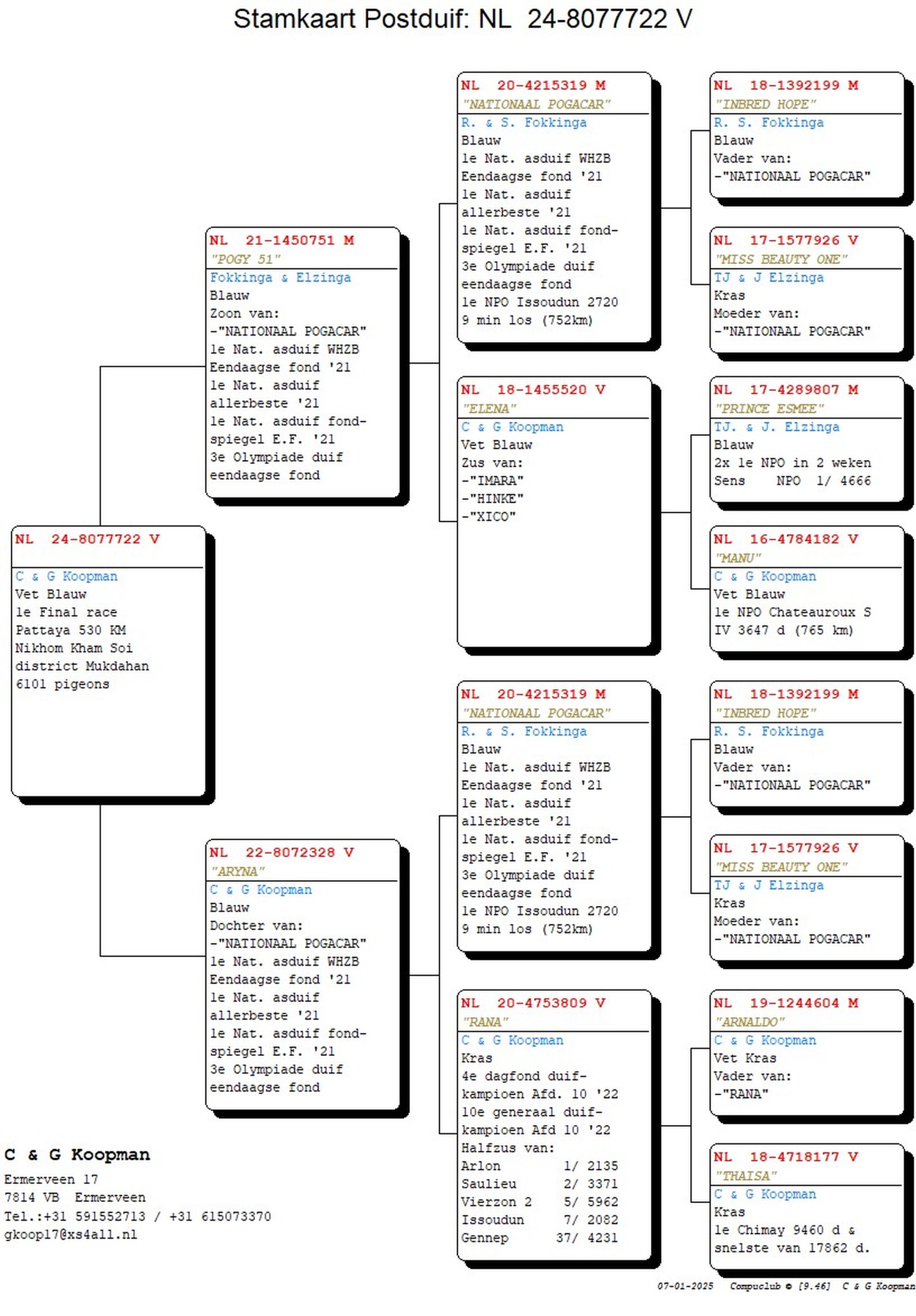 没错!这羽名叫“快速女郎波加萨尔”的灰雌鸽,堪称赛鸽界的“冰与火之歌”——父系为“全国波加萨尔×艾琳娜”直子,母系为“全国波加萨尔×拉娜”直女。这么一出“表哥娶表妹”的神操作,狠狠打了所有唱衰近亲配对的名家的脸。