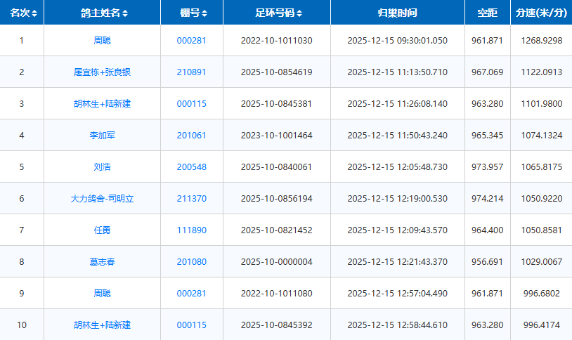 亚军于11点13分报进,为屠宜栋+张良银的2025-10-0854619赛鸽,飞行空距967.069公里,平均分速1122.0913米/分。
