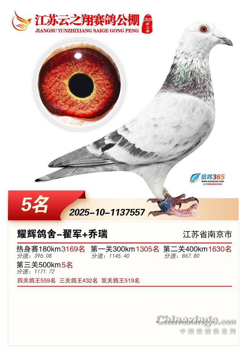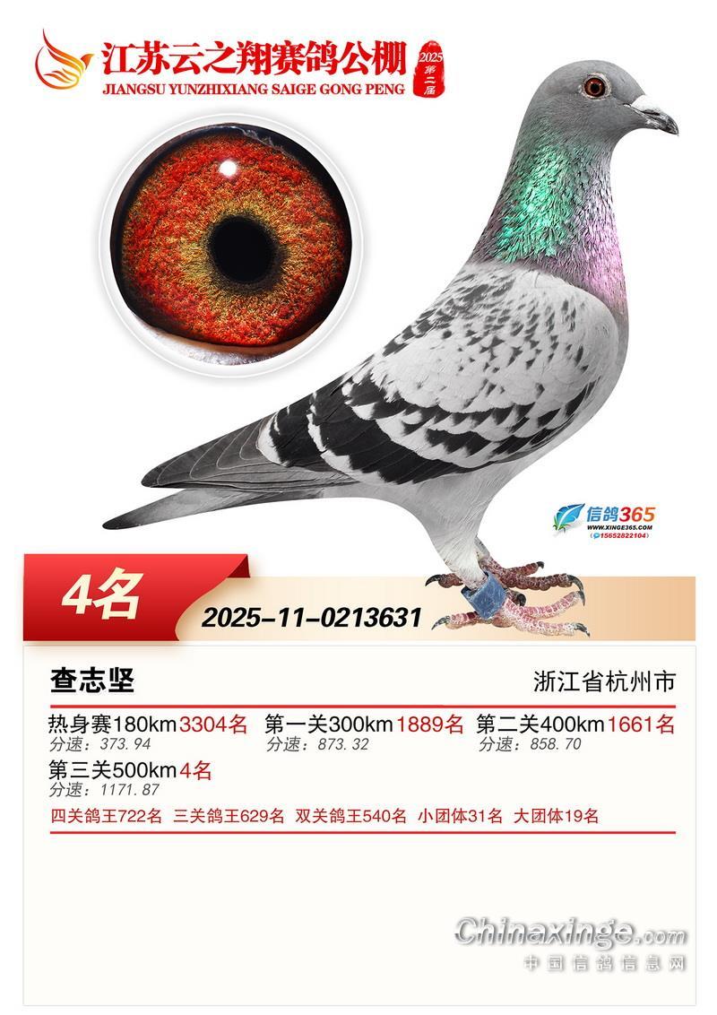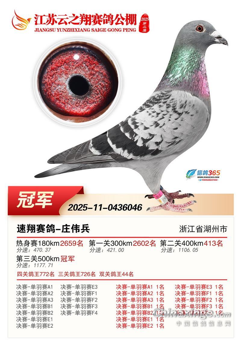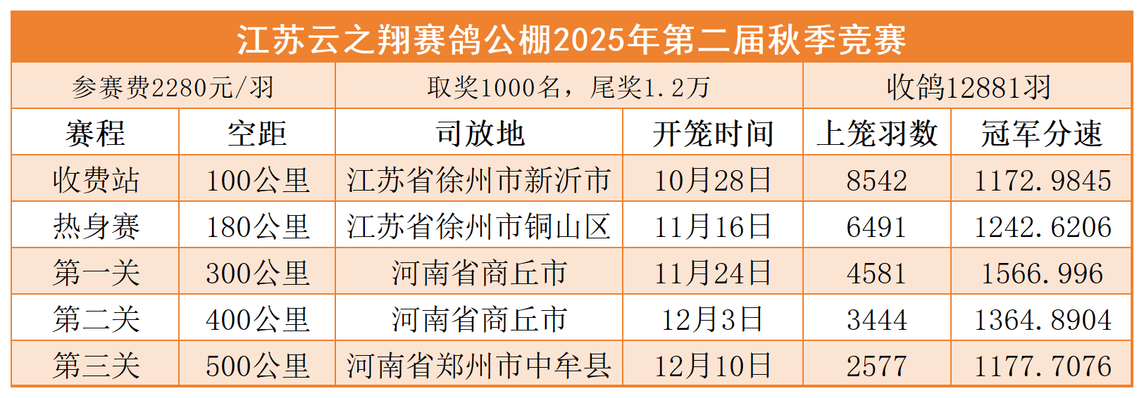 砥砺前行,不负鸽友期许。江苏云之翔赛鸽公棚2025年第二届秋季竞赛已圆满落下帷幕。作为稳步成长的实力公棚,云之翔公棚本届秋赛以公平公正公开为核心,凭借近1.3万羽的收鸽规模、平原黄金赛道的独特优势,从收费站到三关决赛,全程层层筛选、步步淬炼,最终1681羽精英赛鸽顺利归巢。鸽友速翔赛鸽-庄伟兵麾下雨点鸽11-0436046力压群雄,从一关排名两千开外到决赛逆袭夺冠,是一羽不可多得的实力黑马;苏州鸽友邹建华的灰鸽10-0137247,以稳扎稳打的表现加冕三关鸽王冠军。双鸽闪耀,实力印证赛道传奇。近日,2026年云之翔公棚第三届秋季竞赛规程已发布(点此查看规程),26年预交一羽保证金赠送特比环5枚!多交多得!欢迎各位鸽友来参赛。(点此进入会员预定)