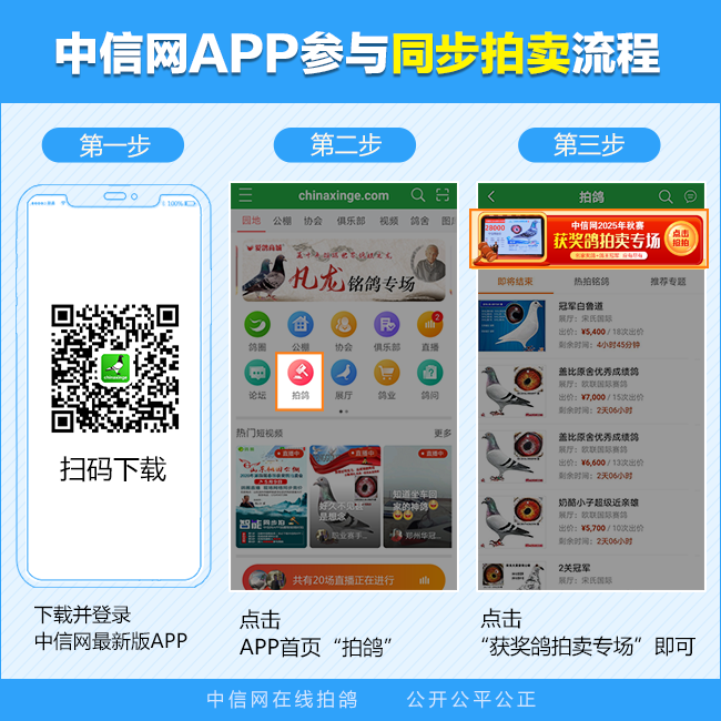 一场汇聚千羽好鸽、万份期待的获奖鸽拍卖盛宴即将登场!12月29-30日,江苏云之翔赛鸽公棚将举行2025年秋赛获奖鸽拍卖大会,为了让全国各地的鸽友更便捷地参加本公棚秋季获奖鸽的拍卖,届时还联合中信网开启“现场与网络同步拍卖+视频直播”服务,鸽友们可登录中信网,提前出价拍好鸽,边看直播边竞价,冠军奖鸽带回家!即刻下载中信网手机APP,轻松出价,快人一步!