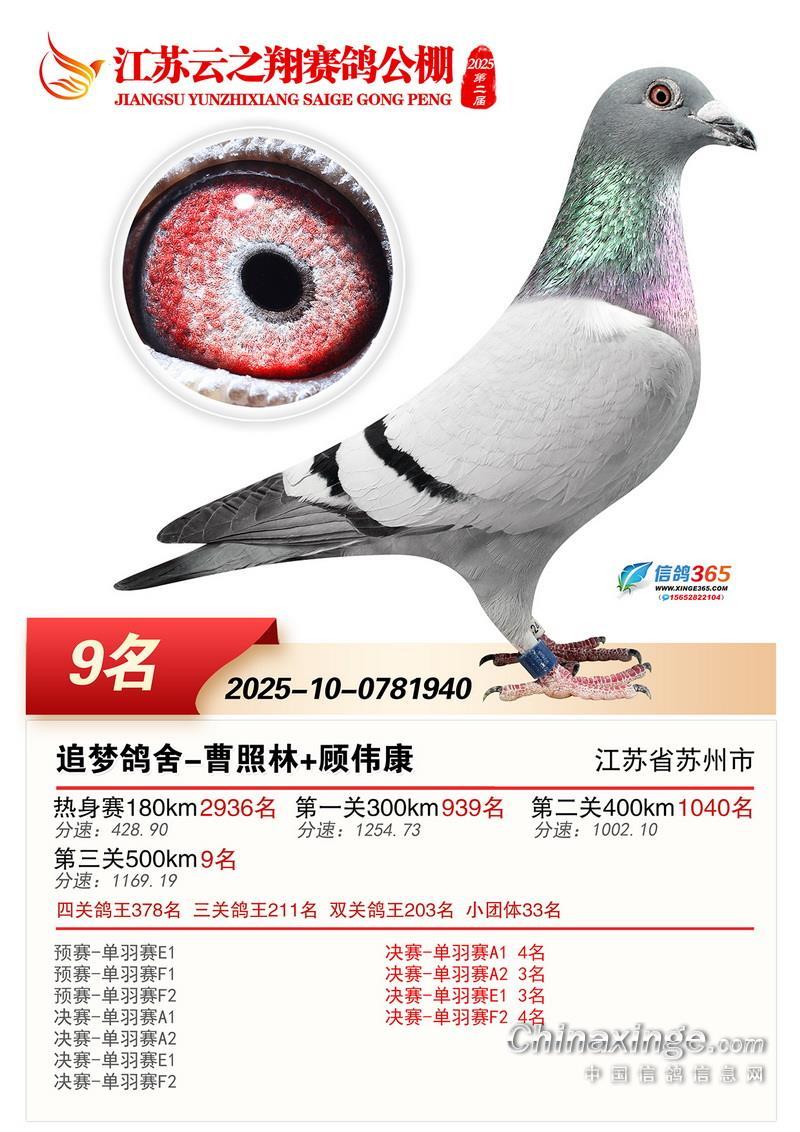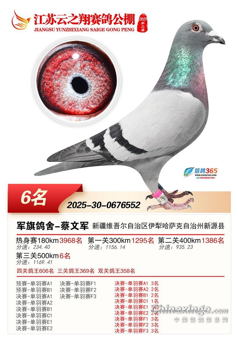 在三关综合成绩中,来自江苏苏州鸽友邹建华的一羽灰鸽,环号10-0137247,展现“稳扎稳打、关关精进”的超强实力。该鸽在第一关排名204名、第二关跃升至20名、第三关稳居27名,以3922.4685米/分的总分速荣耀加冕三关鸽王冠军,双关鸽王冠军、四关鸽王第六名,成为本届赛事全能鸽王。