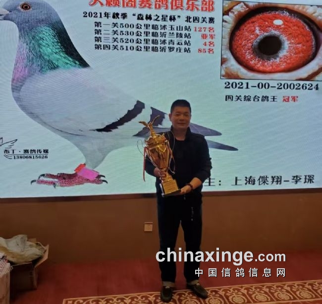 在李琛的赛鸽征程中,最早一次夺冠是:2011年秋,上海VIP赛鸽俱乐部组织三关鸽王赛,他运用“甘纳斯”血系的赛鸽首次勇夺冠军,三关鸽王191名;