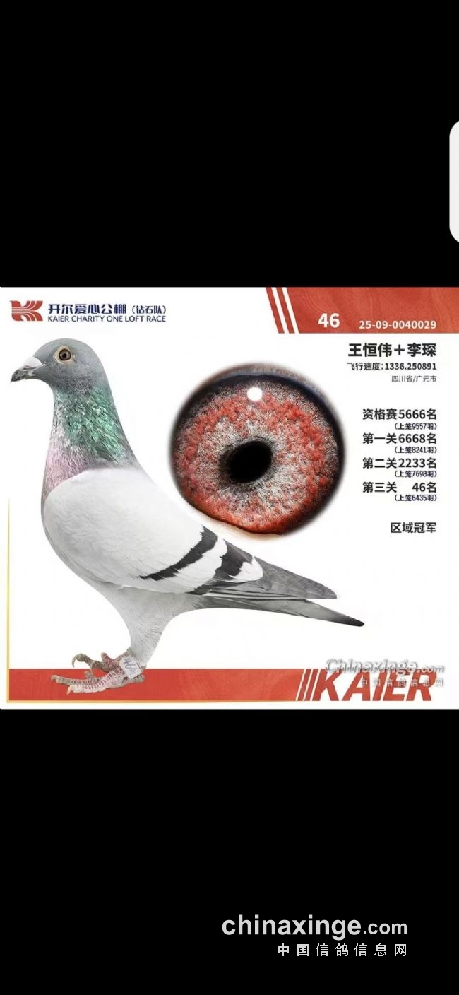 据不完全统计,老“李奥”育种出赛绩:西安威力预赛23名、决赛35名(2013年、子代)→上海黄金海岸350公里季军、决赛121名、236名(2014年、同窝、子代)→西安威力350公里11名(2015年、子代、指定2个冠军1个亚军)→云外水庄4关鸽王78名(2017年、子代)→江苏连云港400公里冠军(2015年孙代)→开尔(钻石队)决赛46名(2025年、孙代)→重庆金通决赛5名、加赛81名(2021年、重孙代)→开尔(钻石队)400公里283名、决赛718名(2025年、重孙代)→重庆龙乡决赛季军(2022年、玄孙代)→江苏千公里联翔季军(2024年、玄孙代)→开尔(铂金队)决赛446名(2025年、玄孙代)→四川大明宫决赛16名、两关鸽王冠军、三关鸽王冠军、四关鸽王亚军(2023年、来孙代)等……五代延续、战绩彪炳。