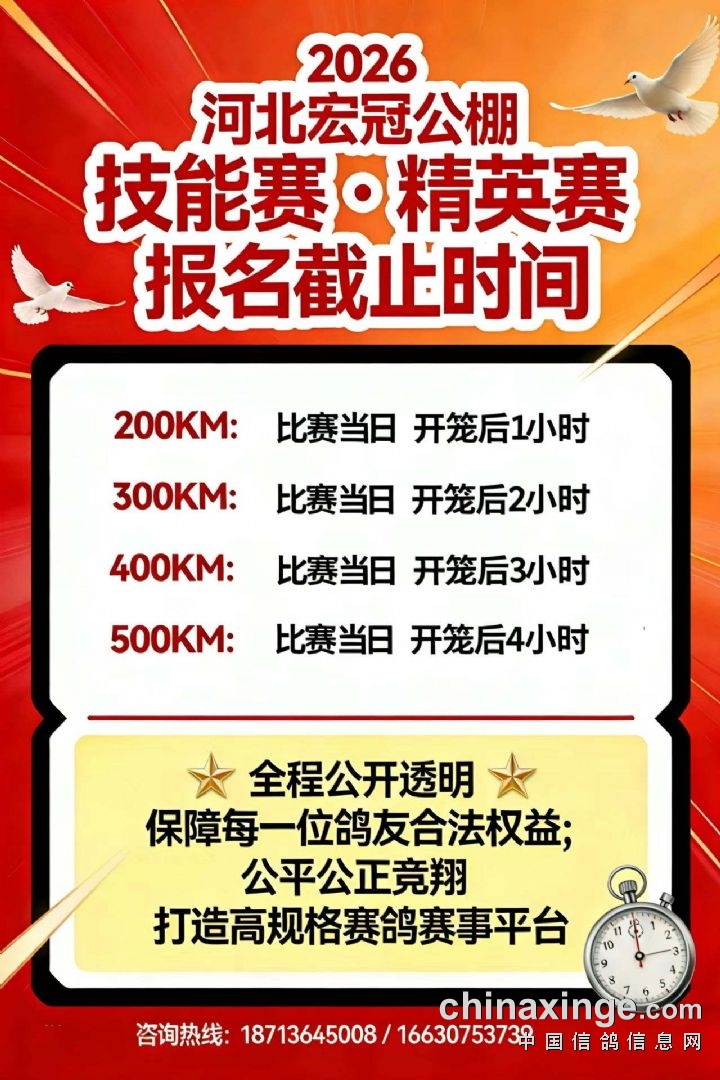 言必信,行必果!2026新赛季,河北宏冠公棚以八项举措为誓,坚守初心、恪守承诺,用科技筑牢公平底线,用规则守护赛事纯粹,用透明赢得鸽友信赖。我们期待与全国各地的鸽友携手同行,共同见证每一只冠军赛鸽的荣耀归航,共创公平竞技、诚信交流的赛鸽新篇章!