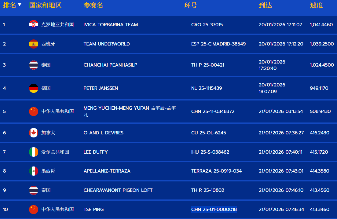 中国鸽友孟宇辰-孟宇凡的一羽CHN25-11-0348372绛鸽,在第二日独自夜行归来,打钟时间为1月21日凌晨3时13分,分速508.9430米/分,获得第五名。鸽友谢炳的一羽CHN25-01-0000018获得第十名。