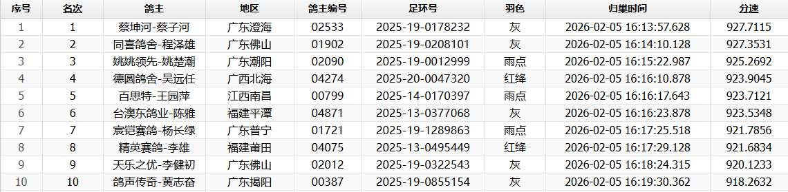 比赛进行9多小时后方才见鸽,冠军来自蔡坤河-蔡子河名下2025-19-0178232灰鸽,于下午16:13:57报进,平均分速927.7115米/分。接着,同喜鸽舍-程泽雄的2025-19-0208101灰鸽拿下亚军平均分速927.3531米/分。姚姚领先-姚楚潮的2025-19-0012999雨点摘下季军,平均分速925.2692米/分。