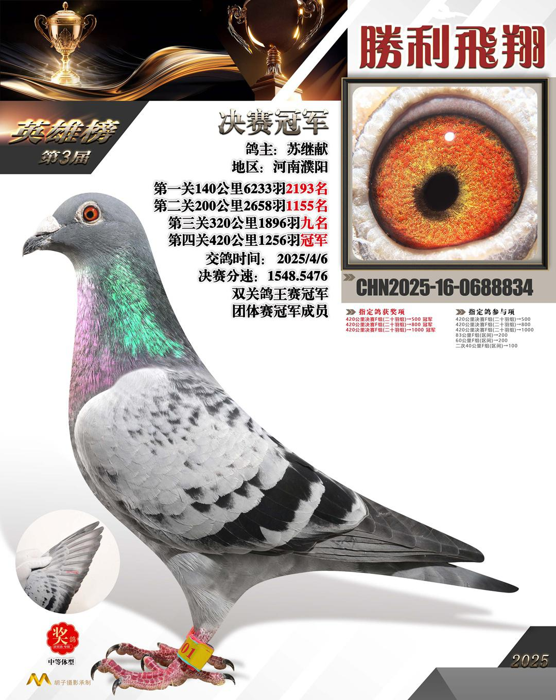 云南宜良胜利飞翔公棚第三届秋赛,参赛费为1180元,决赛取奖800名,前三名的奖金分别为30万、20万和15万。11月30日,公棚决赛在西双版纳南糯山开笼放飞,空距为417公里,集鸽1256羽。崇山峻岭给小将们的归巢带来了挑战,最终仅有55%的赛鸽成功归巢。但鸽友苏继献麾下赛鸽却表现卓越,中午12时45分29秒,一羽2025-16-0688834成功归巢,分速1548.5476米/分获得冠军,这羽鸽子在预赛中就已获得第9名,成功拿下双关鸽王冠军。随后苏继献鸽友麾下另一羽2025-16-0688839成功归来获得季军。苏鸽友也成为本场赛事最大赢家。