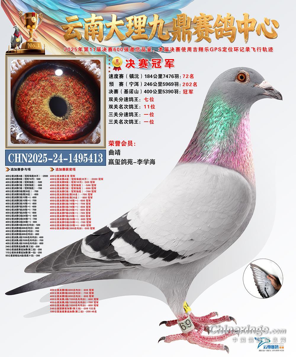 云南九鼎赛鸽中心第十一届秋赛,参赛费1300元/羽,决赛取奖600名,尾奖1.3万。本届比赛收鸽12434羽,连闯三关,战至决赛还剩五千多羽上笼。12月1日,决赛在西双版纳景洪市开笼,空距拉长至400公里。海拔的爬升与地形错落间的气流变化,对赛鸽来说是不小的考验,但开笼五小时不到,第一批赛鸽便迅速归来,鸽友赢玺鸽苑-李学海的一羽2025-24-1495413的灰鸽,以1382.3018米/分的成绩力压群雄,将本届决赛冠军荣耀收入囊中。同时,这羽灰鸽凭借速度赛72名,预赛202名,决赛冠军的成绩荣耀加冕三关鸽王冠军,双冠在手,实力非凡!