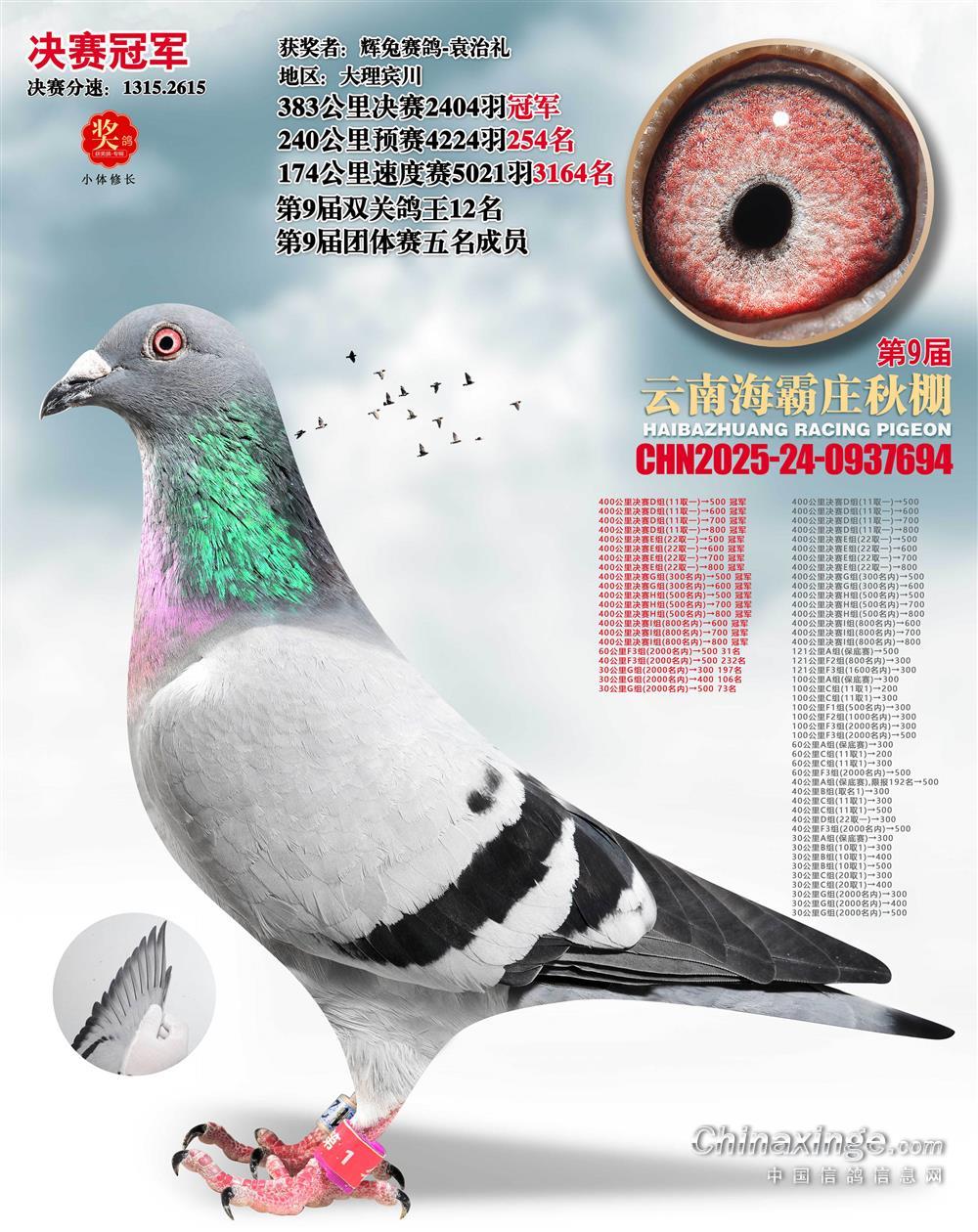 云南大理弥渡海霸庄赛鸽中心第九届秋赛,参赛费1100元,决赛取奖600名,尾奖1万,今年收鸽11540羽,查棚站上笼9399羽。经过速度赛,预赛两关试炼,12月16日,决赛于云南景洪市基诺山打响,2404羽开启了383公里山区终极挑战。当日下午13点48分,辉兔赛鸽—袁治礼的2025-24-0937694灰鸽一骑绝尘,以1315.2615米/分的成绩斩获决赛冠军,这羽赛鸽同时获得了双关鸽王12名,是一羽不可多得的山区猛将。