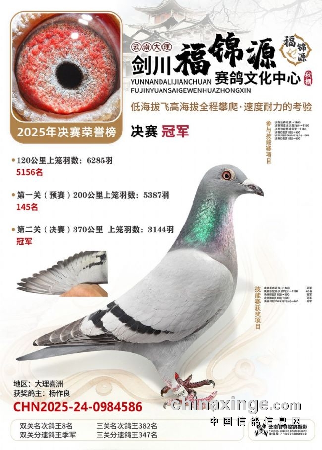 大理剑川富锦源公棚第六届秋季大奖赛,参赛费1160元/羽,决赛取奖700名,尾奖五千。本届秋赛收鸽10006羽,收费站上笼8172羽赛鸽。经过数次短训与预赛后,10月25日,370公里决赛如期而至,3144羽赛鸽于于云南临沧市双江县起飞,进行终极对决。这条赛线需要连续穿越横断山脉纵谷区的核心地带,翻越云岭等南北走向的山脉,难度很高,是筛选名将的天选赛道。但开笼后不到5小时,大理喜洲鸽友杨作良的2025-24-0984586灰鸽打钟归巢,以1260.0808米/分的分速获得冠军。同时,这羽赛鸽还凭借在预赛145名的良好表现,获得双关名次鸽王八名。