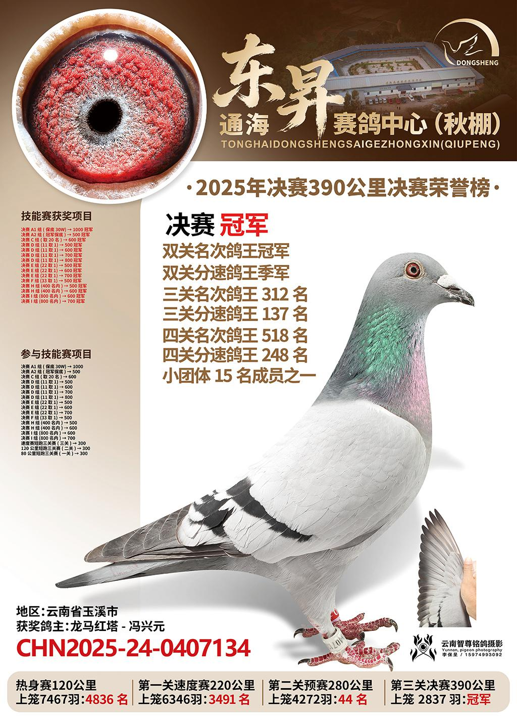 云南通海东昇赛鸽中心第八届秋赛,参赛费1200元,决赛取奖800名,冠军奖金25万,尾奖5000元。12月8日,决赛在云南打洛口岸开笼放飞,共放飞2837羽赛鸽,空距389公里。当天阴天,司放地云层较厚,气温14℃。五小时左右,鸽友龙马红塔-冯兴元的一羽2025-24-0407134灰鸽率先打钟归巢,分速1265.1303米/分,获得决赛冠军。同时,这羽赛鸽还凭借预赛44名的好成绩,获得双关鸽王冠军。双冠在手,实力不容置疑。