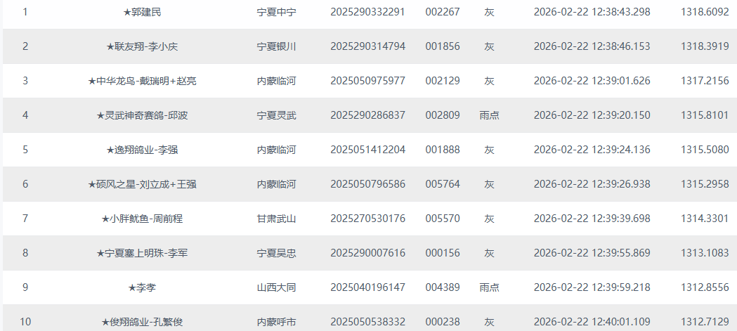 12点38分,第一梯队凯旋。★郭建民的2025290332291灰鸽领跑全场,以1318.6092米/分的分速摘冠。★联友翔-李小庆的2025290314794灰鸽随后拿下亚军,平均分速1318.3919米/分。之后,★中华龙鸟-戴瑞明+赵亮的2025050975977灰鸽获得季军,平均分速1317.2156米/分。